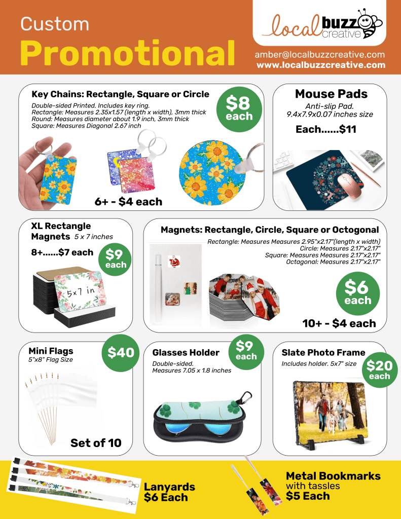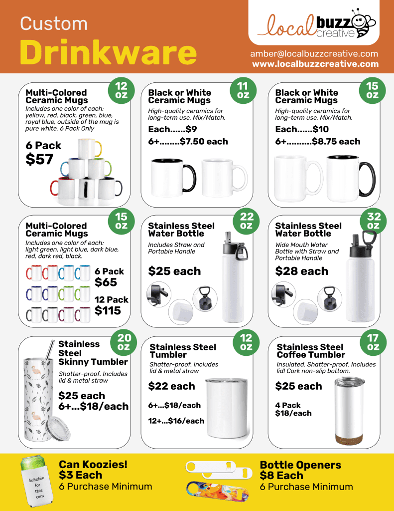 Check out everything Local Buzz Creative has to offer for custom made products! Work with me to design your product! Contact me to learn more!