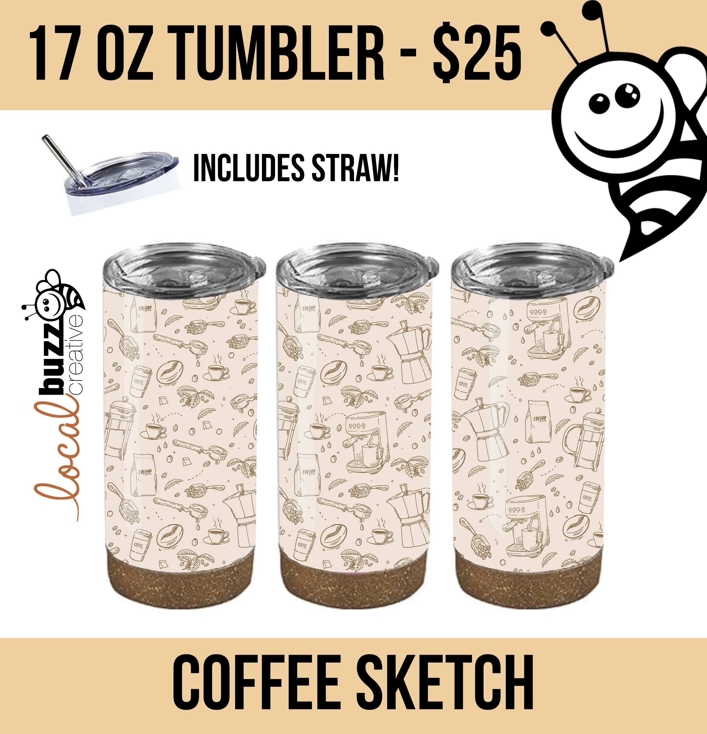 17-oz Straight Coffee Tumbler. Stainless steel – Insulated. This insulated double wall tumbler comes with a secure-fitting lid and a cork silicone base to prevent tipping and ensure stability.